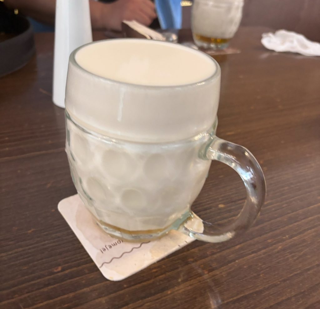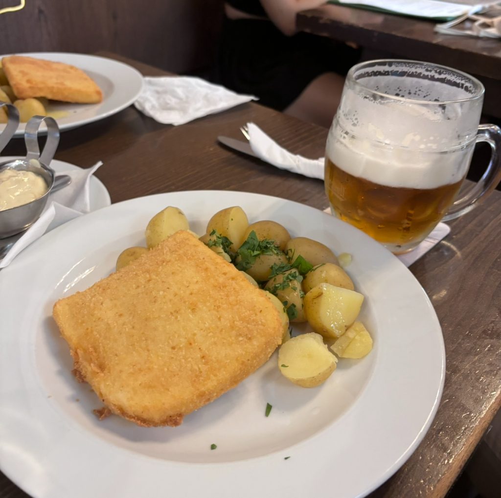 The biggest highlight here is their exceptionally fresh Pilsner Urquell draft beer. They store it in specially designed large tanks to maintain optimal freshness. When ordered, the beer is poured into a clear glass, full of foam and perfectly chilled – it was simply fantastic. As the Czech proverb says, “Beer begins with foam,” and indeed, the rich foam made the beer smooth to drink and enhanced its aroma.